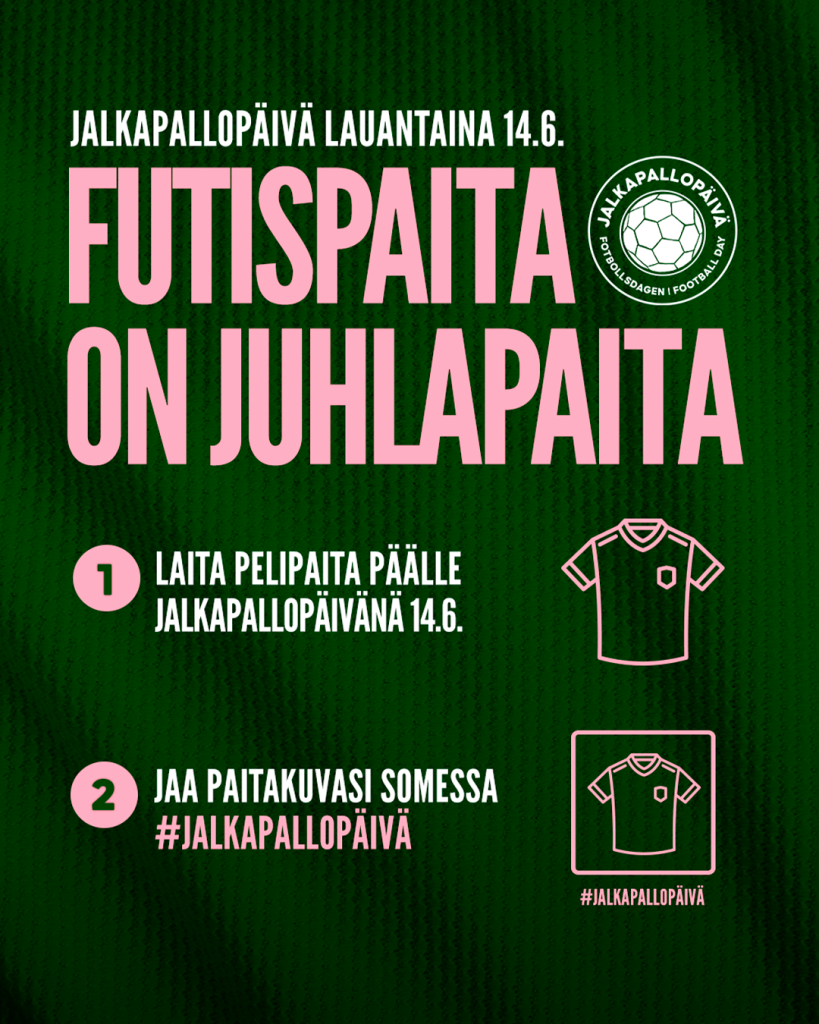 Valtakunnallista Jalkapallopäivää juhlitaan lauantaina 14. kesäkuuta ympäri jalkapalloa rakastavan Suomen. Perinteitä kunnioittaen ja samalla uutta kulttuuria luoden Jalkapallopäivänä kannustetaan aivan jokaista jalkapallon ystävää pukeutumaan futispaitaan ja tunnustamaan kuningaslajia.